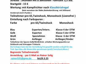 Hallo Jessica, vielen Dank für die Infos. Trialer und auch Motorräder jeden Alters gehören natürlich zusammen. Daher ist die Trainingsidee total prima. Könnte man aber noch attraktiver anbieten. Ohne Lizenz geht es ja schon, dazu bitte ohne Voranmeldung und bitte keine 20,- Startgeld. Gern 10,- für Trainingstag ohne Wertung und ohne Preise. Ich werde das mal beobachten. Danke und viele Grüße von Axel